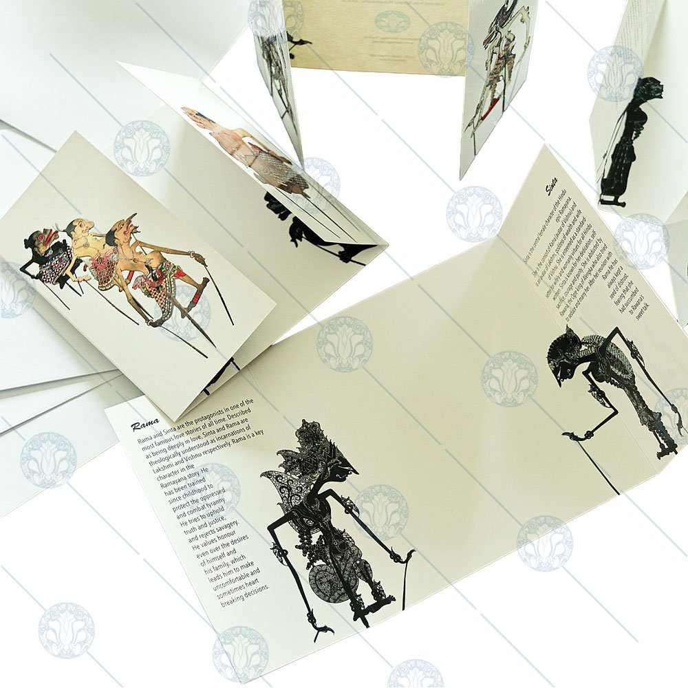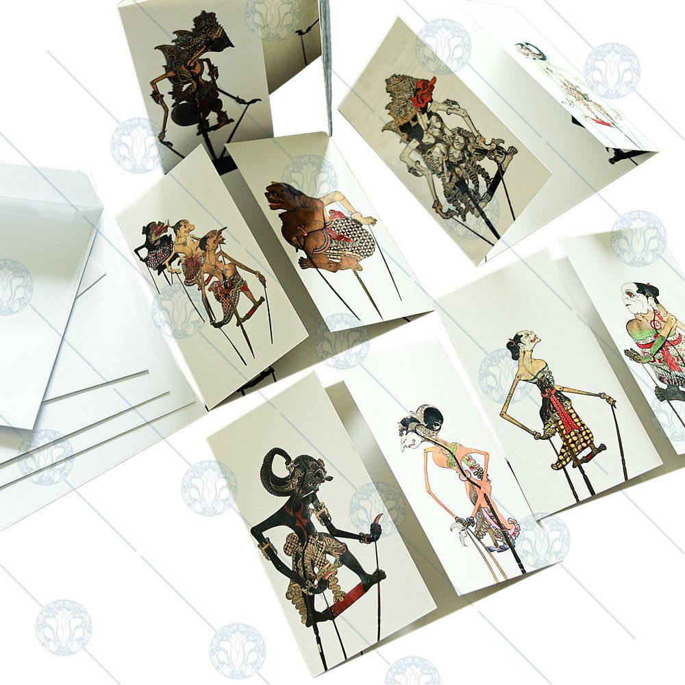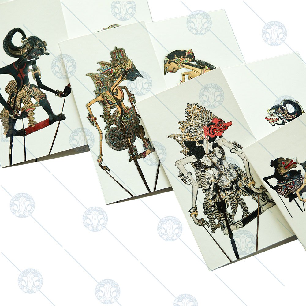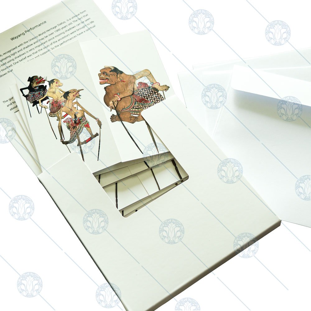 A boxed set of five beautifully crafted tri-fold cards featuring the family groups of wayang kulit, Indonesia’s iconic shadow-puppet tradition. Each card introduces key characters, their roles, and their lineage, with space in the centre for your personal message. Packaged in an elegant box, it’s perfect for gifting or collecting.